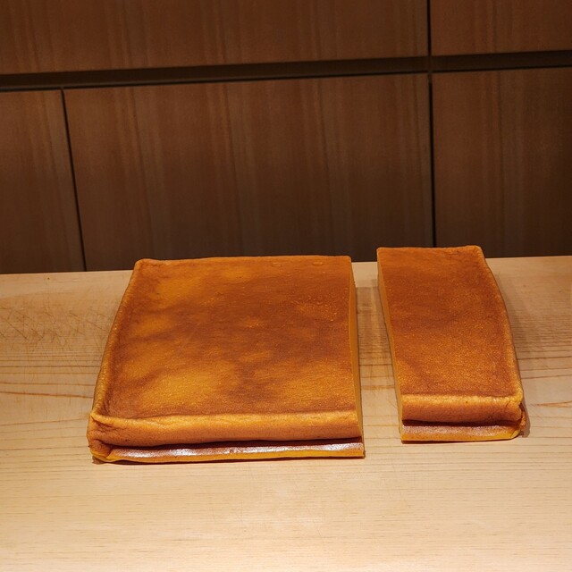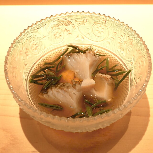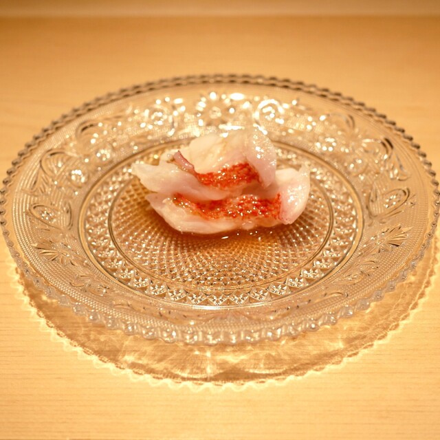 この時期は、名物の蝦蛄が出されます。子持ち蝦蛄を半熟卵の状態で頂けます。見た目のコントラストが美しく、食べてもトロッとした食感の卵かけご飯ならぬ、卵かけ蝦蛄の様な感じです。元々、子持ち蝦蛄の卵部分がコリッとした食感も好きなのですが、こちらでしか頂けない蝦蛄は唯一無二の蝦蛄です。仕入れた蝦蛄の内半分は卵の量が足りずトロリ感が出ないという事で廃棄しないとならないそうです。6月以降も蝦蛄は有るのですが、卵の量がより少なくなるので、更なる選別が必要となり、5月ないし6月初旬までの限定のものになってしまうそうです。