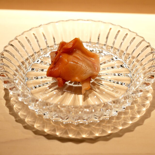 鮑、積丹のムラサキウニ、蓴菜、岩もずく入りの水貝で、サッパリと頂けます。特に鮑のコリコリシャキシャキ感が良いのと、包丁の切り込みが噛み合わせにベストの状態でマッチしており更に美味しく頂けます