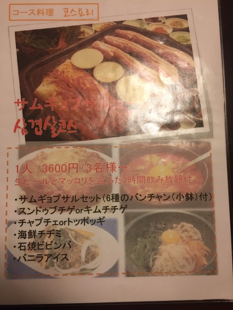 サムギョプサルをメインとしたコース料理+2時間呑み放題が3600円でしっかり楽しめちゃいます。
