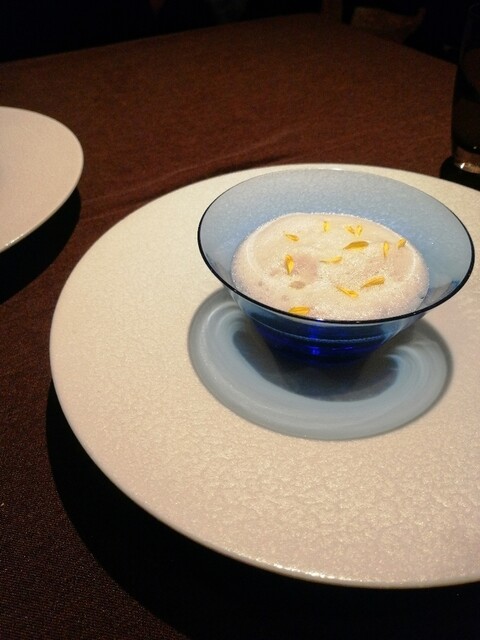 ・金柑とフォアグラのキャンディ →口に入れた瞬間にフォアグラのうまみと甘味が”ずどん!”と来る一品。金柑の果実も入っていて、いい仕事してる。アミューズのなかではこれが一番おいしかった&感動しました。