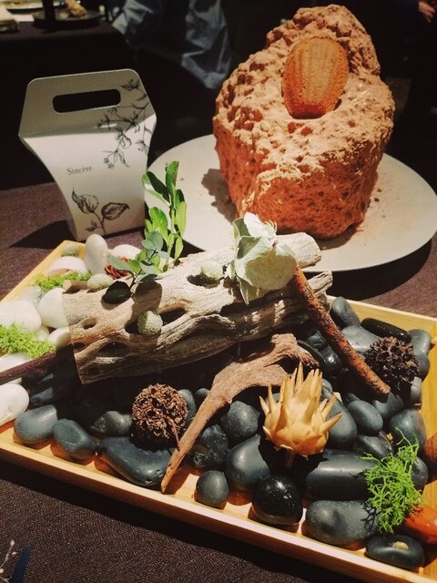 石に見立てた味噌を練りこんだ生チョコ、木の実に見立てたほうじ茶とアーモンドのシュークリーム、同じく木の実に見立てたカシューナッツショコラ。生チョコは特に感動でした。