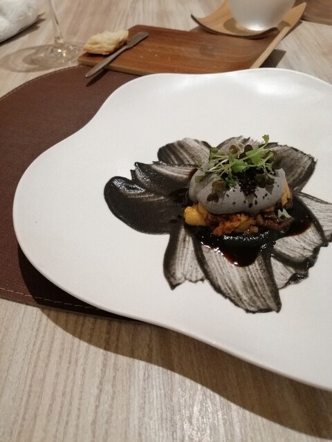 よく似たメニューを他のフレンチの名店でも食べたことがあるのですがこのカカオバターでコーティングされた一品、中からフィリングがじゅわっとあふれ出て本当においしいのです。