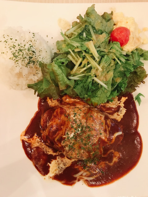 箸休めにサラダに手を伸ばすと、こちらもいい意味で予想を裏切られました。 りんごのすりおろしとイタリアンドレッシングを合わせたような、さっぱりフルーティーな味です。あくまで脇役でありながら美味しく、でもハンバーグを恋しくさせる良い加減。 ハンバーグの合間に食べることを計算され尽くされた味です。すごい……。 この完成度なのに、店の名物はなぜかオムライス。ハンバーグは全く推されていません。オムライスどんだけ美味しいんでしょうか。 またランチで来ます!ごちそうさまでした。