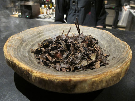 スパイス、カカオの皮、イチジクの葉、アマレットでサステナブルカクテル次のお料理が経産牛なので、廃棄されがちな外皮を使ったサステナブルを意識したカクテル