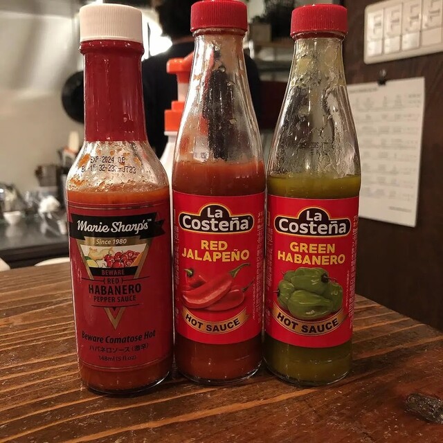 タコスに合わせて辛いソースも用意されています。一番左の辛かった〜