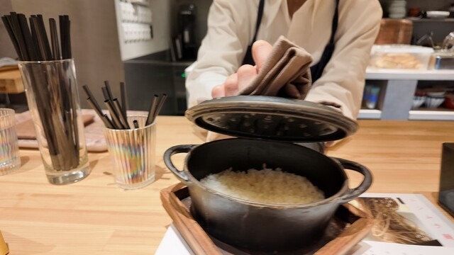 お決まりの麺の後のご飯は、炊き立てのストウブで炊かれたご飯。