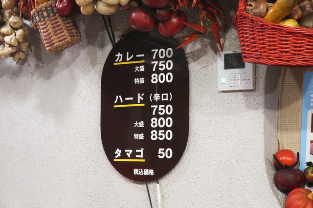 カレーは2種類あり、スタンダード(※メニューには「カレー」とだけ表記)とハード(辛口)の2種類。昨今流行りの揚げ物トッピングやサラダなどのサイドメニューもなく、唯一あるトッピングは、玉子(茹 or 生)50円のみ。おそらく創業時と同じメニュー構成ではないかと思われる。そして価格はスタンダードで700円と、価格高騰のご時世で、この価格は安い!しかも、嬉しいことに、大盛・特盛との価格差は50円刻み。