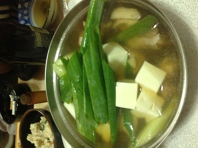 日本酒を呑みながらネギと鶏のこなべをつつく