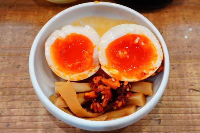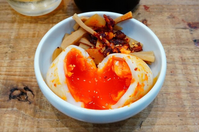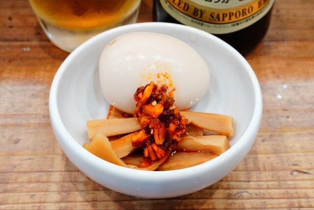 18:35声が掛かりカウンター席へ案内されると直ぐに冷えたグラス&赤星中瓶が到着、自家製ラー油が掛かった温かなメンマ&味玉のアテもいただけ一人乾杯♪