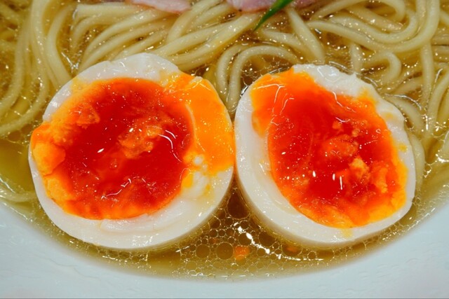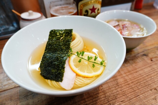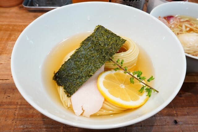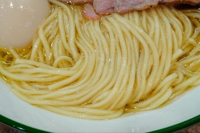 キラキラと油玉が浮かぶコクのある上質な鶏油と動物系の旨味がタップリと感じられる出汁に、魚介乾物も僅かに後支えする円やかな塩ダレが塩梅ジャストで絶妙に調和したコク旨淡麗塩スープとコキュッと小麦香る麺が口内でマリアージュして…堪らなく美味しく啜れます♪