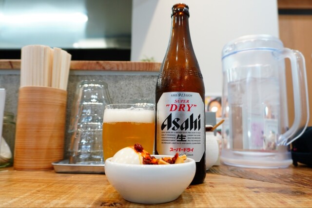 20:10カウンター席へ案内されると直ぐに冷えたグラス&スーパードライ中瓶にゾンビ玉のアテもいただけ、一人乾杯〜♪