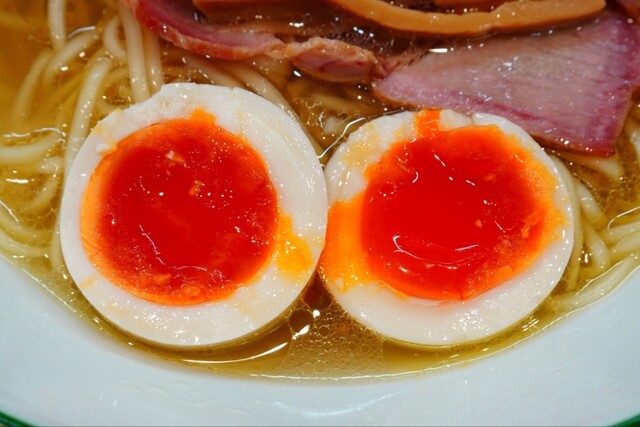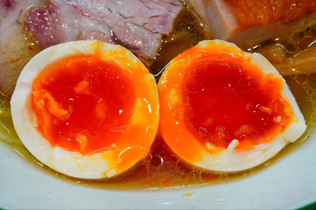 豚チャーは2種入っておりシットリ柔らかチャーに燻香良いチョイ厚カットの肉々しい吊るし焼豚、ブロック状にカットされた柔らで大きい鶏モモチャーも炙りが入って香ばしく、チョイ太メンマ数本ははコリッと香り高く、パリッと香り高い上質な海苔は麺と共に、味玉は黄身鮮やかなオレンジ色したシットリネットリドロ〜リ状で、秀逸な具材達をアテに赤星も美味しく飲み干せました^^