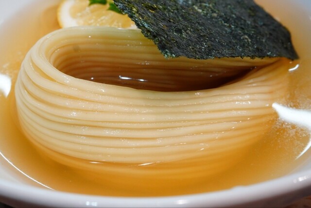 薄っすらフスマが確認できる菅野製麺製のストレート中細麺は茹で加減ジャストのサクプツッとした心地良い歯切れで、ロングカットの小麦香る靭やか滑らか麺と淡麗塩スープが口内でマリアージュして…堪らなく美味しく啜れます♪