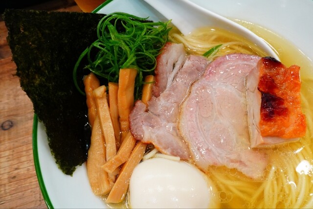 薄っすら油膜張る表層をキラッと煌めく上質なコクのある鶏油と動物系のコクに魚貝乾物の旨味も感じられる円やかな塩ダレが塩梅ジャストで程好く効いた膨よかコク旨淡麗塩スープとニュルリコキュッと小麦香る麺が口内でマリアージュして…毎度堪らなく美味しくニュルズバと啜れます♪
