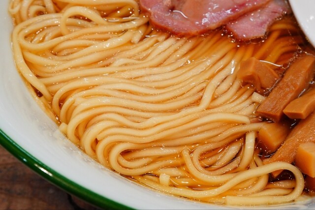 キラッと煌めく琥珀色した綺麗なスープは上質な鶏油のコクに動物ベースの旨味がタップリと抽出された魚介がサポする出汁に芳醇な醤油ダレが塩梅ジャストで絶妙に調和した、牛蒡がフワッと香る雑味なくクリアな大変美味しい適温熱々のコク旨淡麗醤油スープで…ヤッパリ牛蒡がナイスアクセントです。