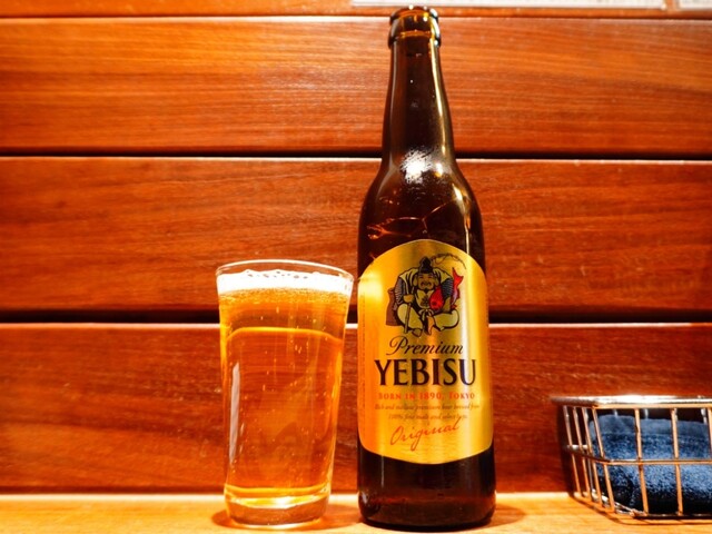 カウンター席へ座ると直ぐに冷えたグラス&YEBISU小瓶が到着し、一人乾杯〜♪
