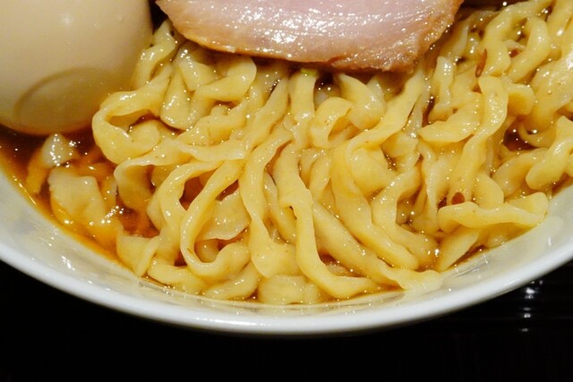 茹で前に麺箱の上で丁寧に手揉みされた粒々がハッキリと確認できる平打ち縮れの中太麺は強い捻りがポコポコと啜り心地楽しい弾力とコシを兼ね備えたムチシコな抜群の歯応えで、確りと小麦が香る自家製みつヰ麺と芳醇醤油スープが口内でマリアージュして堪らなく美味しく啜れます♪