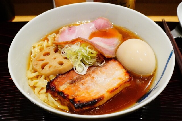 醤油(中太手もみ麺)+味玉+エビスビール(中瓶)