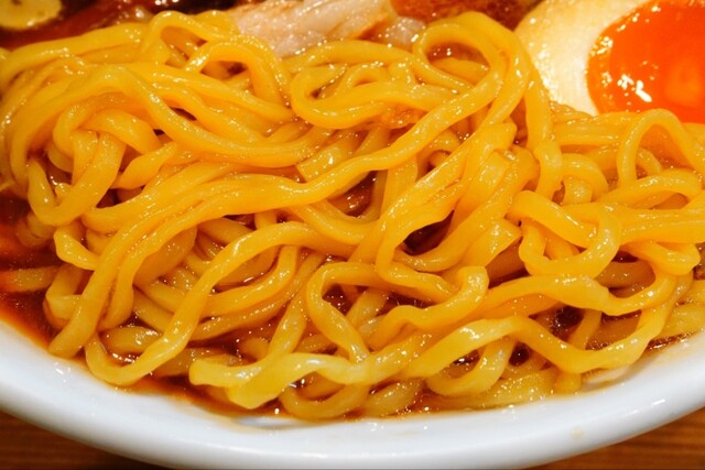 テカテカ光る緩くウェーブした黄色い中麺は弾力とコシを兼ね備えたプリシコッとした心地良い歯切れで、ズズッと啜り咀嚼すれば小麦の香りと生姜の香りが口内でマリア〜ジュして…堪らなく美味しく啜れます♪