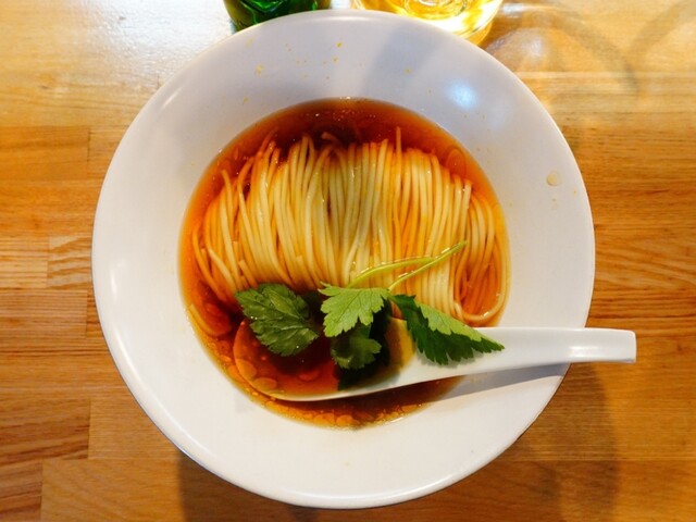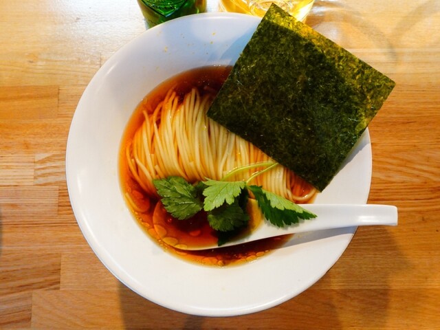 鶏油玉が疎らに浮かぶ透き通った黄金色のスープは鶏魚介の和な出汁に白醤油が優しく絶妙に調和した、雑味なくクリアで仄かな甘さのジンワリ身体に染み渡る大変美味しい適温熱々の無化調清湯白醤油スープです^^