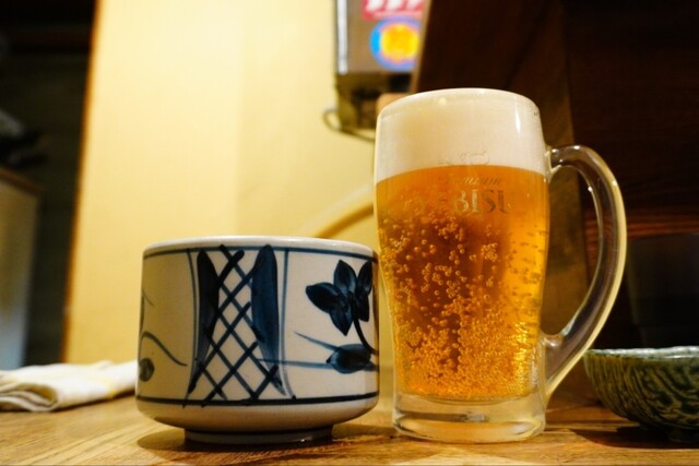 直ぐに冷えたジョッキに注がれたYEBISU生が到着、サービスのアテもいただけ一人乾杯♪