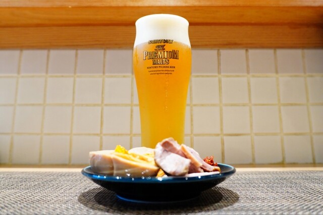 冷えたグラスに注がれたプレミアムモルツ生&おつまみが到着し、一人祝杯〜♪