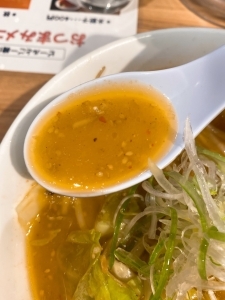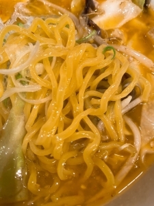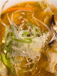 スープは熱々です。味噌がまろやかな味わいですが、ピリ辛が効いています。