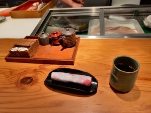 ちょと上等な紙おしぼり。目の前のカウンターには冷蔵ケースがあり魚が並んでいます。