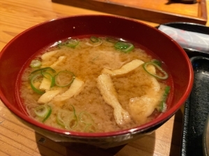お揚げさんとネギのシンプルな味噌汁ですが本格的なダシが効いています。