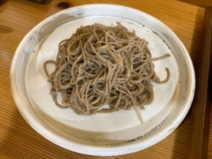 今日のランチは、「石臼引き手打蕎麦 むら木」。西大路高辻交差点の西にあるお蕎麦屋さん。控えめで一見しておそば屋さんとは思えない外観です。よく見ると営業中と分かります。不規則にテーブル席が並びます。そばは白と黒があります。どちらも十割です。食べ方はいろいろで、辛味大根おろしとか鹿肉のつけ汁とかマニア受けしそうなメニューが用意されています。壁の黒板には季節の天ぷらがあります。鯖寿司なんかも魅力的です。いろいろ迷いますが欲望のまま、「二色ざる+はも天ぷら+鯖寿司」を注文し2500円也。ちょと豪華な蕎麦御前になってしまいました。そば茶と蕎麦かりんとうが出てきます。つゆに塩にネギがセットされます。天ぷら、鯖寿司と出てメインの白そばが出ると一応完成形です。白蕎麦を持ってくるとのびるので急いで食べてくださいと注意があります。白が片づかないと黒が出ません。天ぷらの鱧は熱々ほくほくで塩がぴったりです。思った以上にたくさん盛ってありコスパよしです。鯖寿司は酢が強くなく、ご飯も軟らかでソフトな印象です。白蕎麦は細く艶やかで極細でつるっとしたのどごしです。甘みを強く感じます。黒は皮を練り込んだ挽きぐるみで風味が強くザラッとした食感です。二種類の蕎麦の違いを味わいながら、さらっとしたそば湯でゆったりとした気分になります。本格的なそば屋でレベルの高い蕎麦と蕎麦前をいただきました。