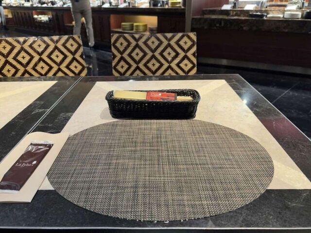 洗練されたウェイターに席に案内されます。ランチョンマットと紙ナプキン、紙おしぼりがセットされています。
