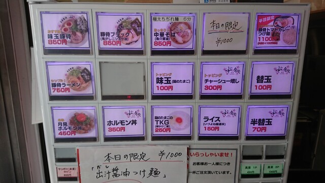 『味玉豚骨』でもよかったんですが、もう一つのお目当て『月見ホルモン丼』に玉子が乗っかっているため、『豚骨ラーメン 750円』と『月見ホルモン丼 450円』のボタンをペチンポチンと押します