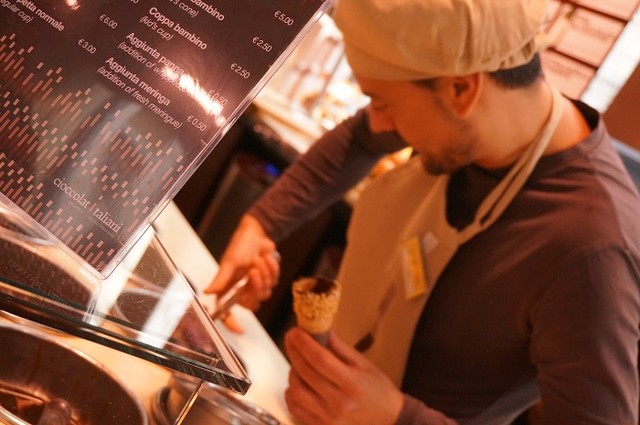 美味しいものには目がないイタリア人たちが、列をなしてまで群がるジェラート。ドキドキしながら順番を待ちます。
