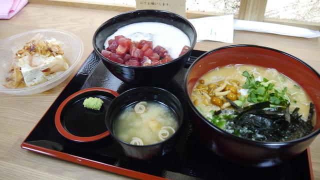 注文したのは、まぐろ山かけ丼(850円)&汁とろろそば(900円)と高尾峰尾の冷奴(330円)