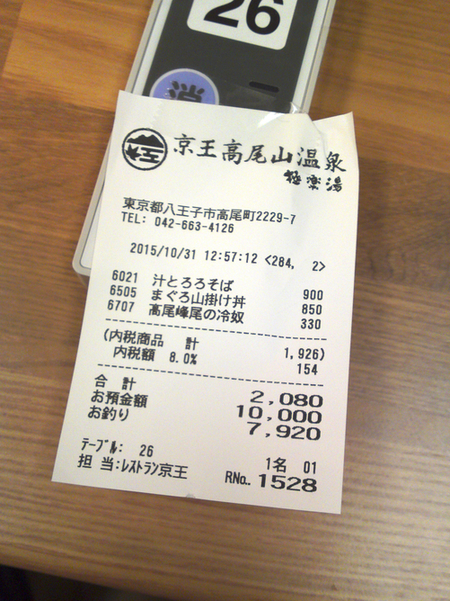今回は混雑していたためか、番号付きの携帯ブザーに領収書を貼ったのを渡されて、