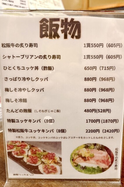 松阪牛と生タン塩セット(3443円)、厳選5点盛り200g(4290円)、ホルモン4種盛り(1738円)、石焼ビビンバ(858円)、ライス大(363円)、マッコリ(550円)、ジンバック(550円)を注文。