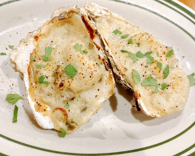 カキの殻つきグラタン(550円)×4、グラスワイン白(750円)×2、グラスワイン白(650円)を注文。