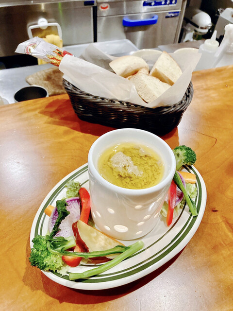 突き出し(500円)のバーニャカウダも久しぶりにいただきました!野菜甘いしパンも美味しいし最高♡