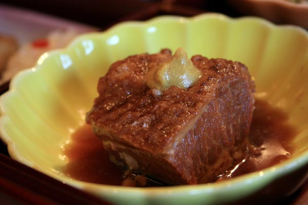 松華堂は鰆のゆうあん焼き、酢のもの、豚の角煮、ごまみそ和えの4品。