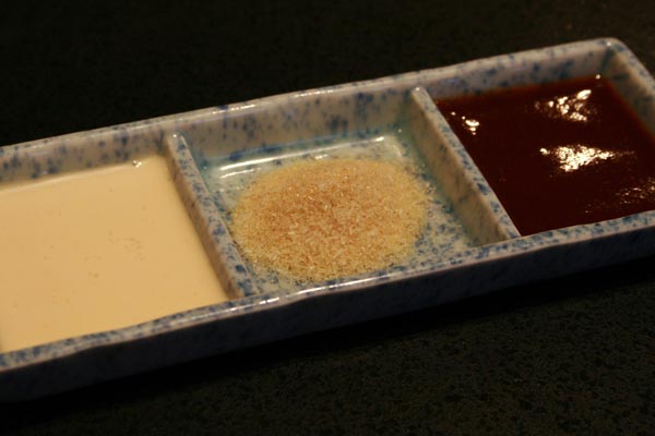 つけだれはカツソース・マヨソース・カレー塩の3種類。どれも山崎さんの手作りで、一味違う美味しさです。