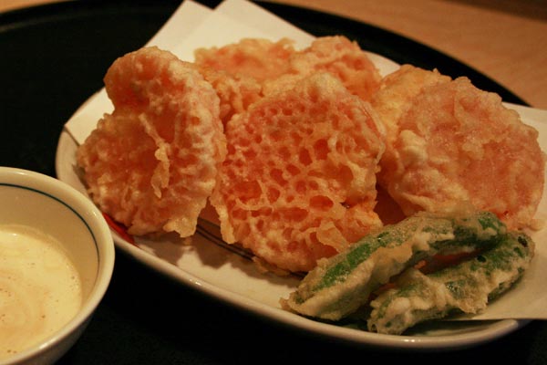 まずは目の前で揚げてくださる様子を眺めながら小鉢をいただきます。今回の小鉢は糸なんきん。日本料理に良く使われる食材で、シャキシャキした食感が特徴的です。こういった食材をさりげなく使われるのも、経験豊富な山崎さんならでは。