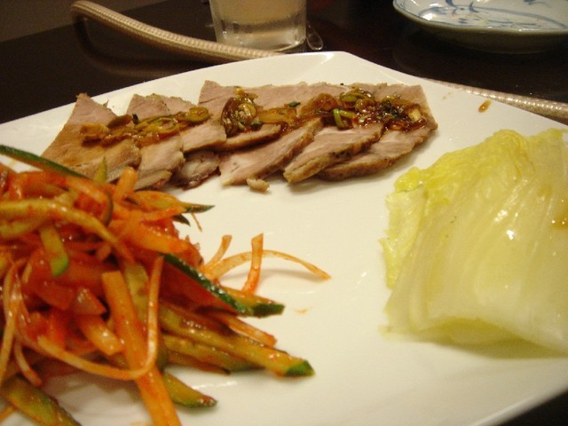 茹でた白菜に包むようにして、お好みで辛めの野菜と一緒に食べる。