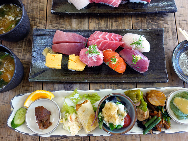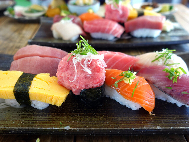 間をあけず、感じの良い店員さんが手際よくドーンと!前菜プレート、品数と見た目に圧倒されていると、テンポ良くドドーンと!来ましたビッグなお寿司、前菜を上回るド迫力にビックリ!思わずほほも緩んでしまいます、が、これが準備運動、手づかみで大きく口を開けて、大きな握り飯をほおばるようにかぶりつきます。なんでも小振りになる時代に、この超常識感、ほおばる贅沢、これも食の楽しみだなーと、満腹、満福です。