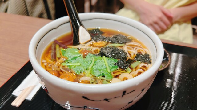 今回は夏季限定の「冷やしあげもち山海風そば」を注文。