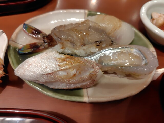 お茶を注文してお寿司に切り替え、鯛の吸い物をいただきながら、【赤身】【トロ】【春子】【ヒラメ】【鰺】【(生)車海老】を握ってもらいました。最後、ご飯なしの【玉子】をいただいてシメ。お味、雰囲気、コスパ全て最高のお店です。