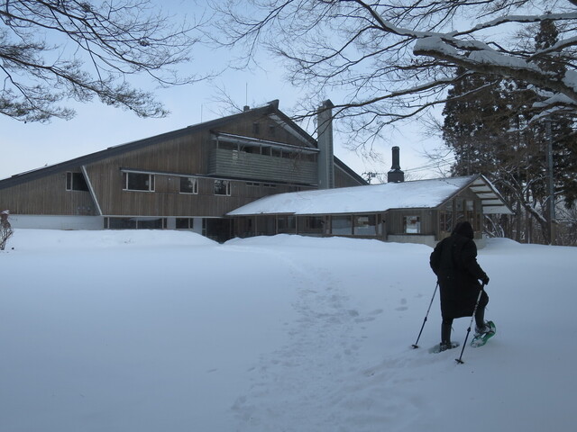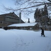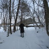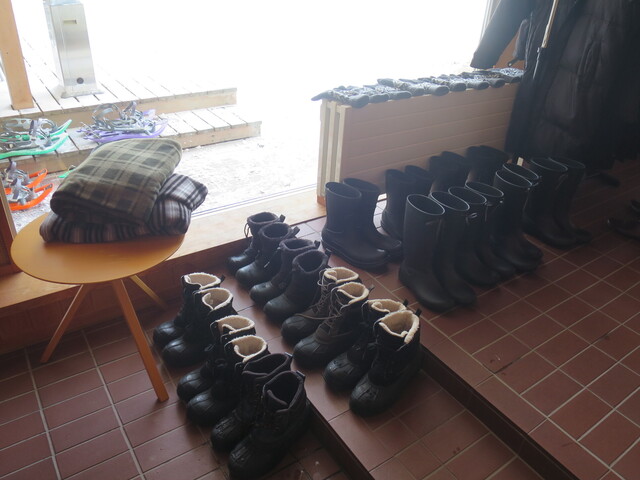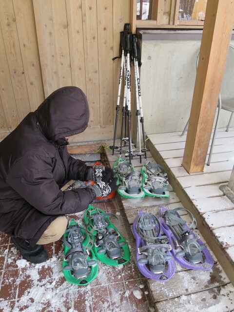10:15 スノーシューをはいて庭を散歩 ブーツも手袋もコートも用意してあります。サラサラのパウダースノーの新雪を歩くのは気持ちいい!!
