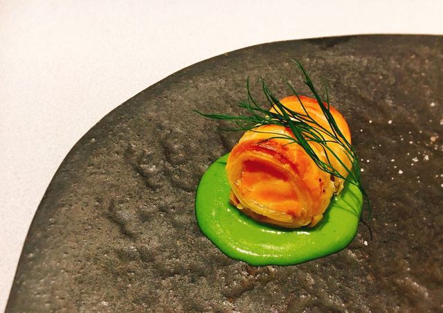 ソテーした羽太を重ね、西京味噌のソースで