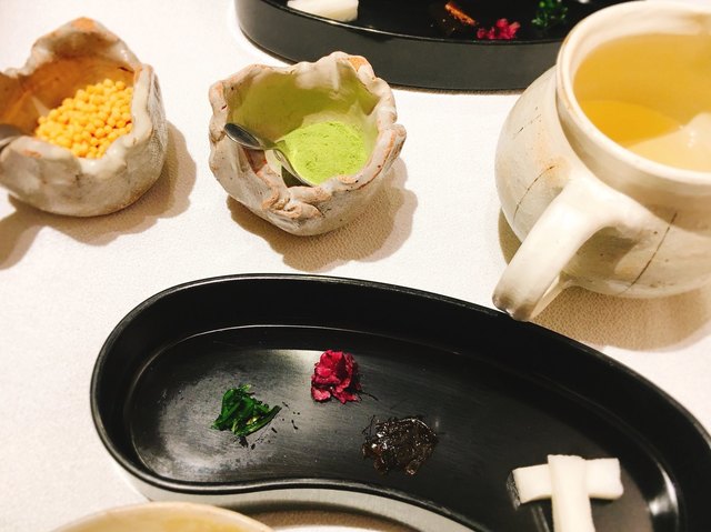 海月、湯葉、生麩、カステラ、ツナのグジェール、鱒、うずら、いぶりがっこ、南瓜、椎茸、海老、ローストチキン、紅蒟蒻・・・