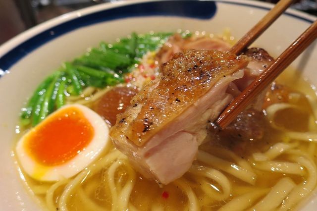 トッピングは鶏モモのロースト。スパイシーな味付けが、塩スープの中で引き立ちます。