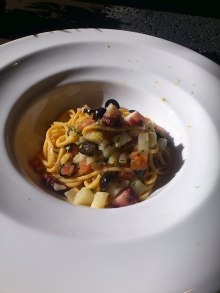 気仙沼産の地ダコとじゃがいも、ブラックオリーブのパスタ。